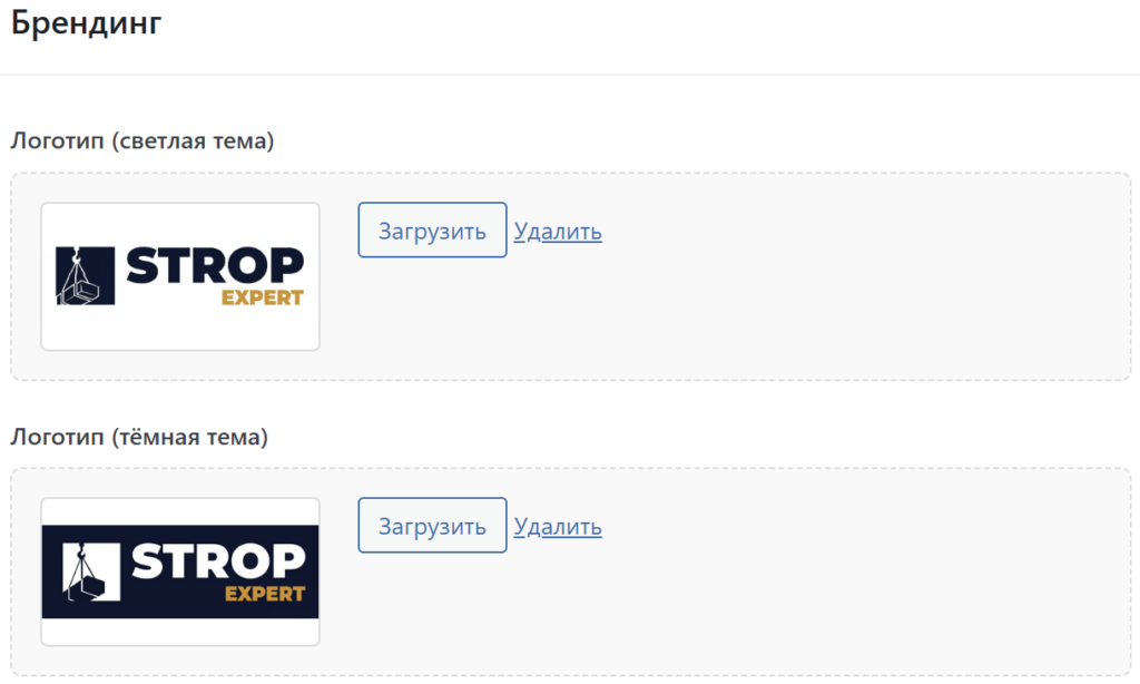 .png) для светлой и темной тем. - Если логотип не загружен, в шапке приложения будет отображаться строка поиска на всю ширину экрана. Если логотип загружен, он будет отображаться слева, а поиск — справа.