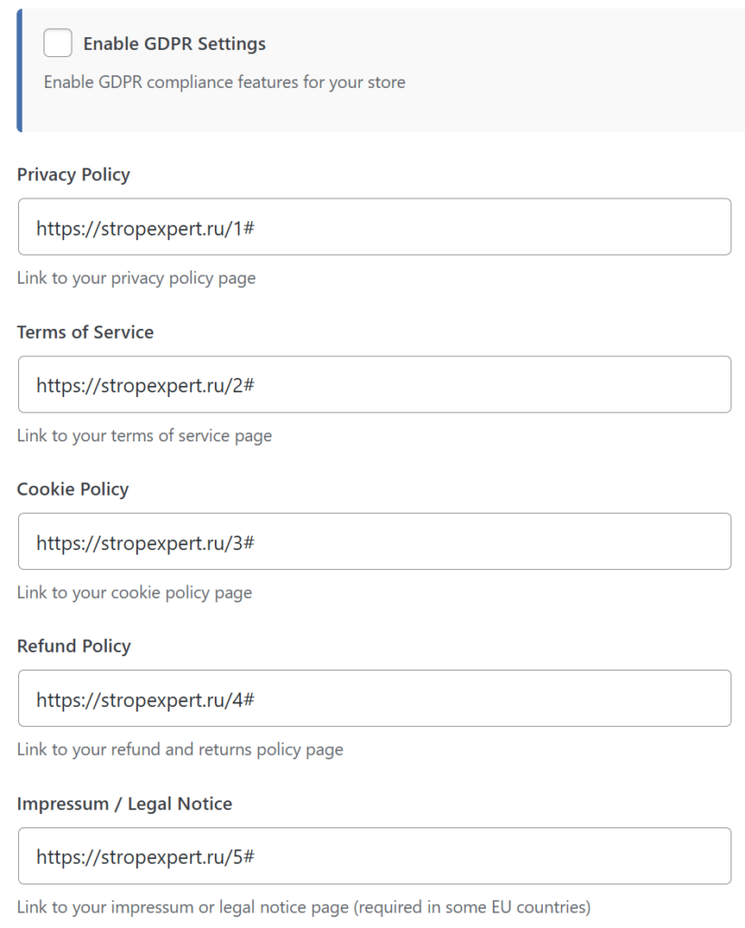 - В соответствующие поля вставьте URL-адреса юридических документов вашего магазина: