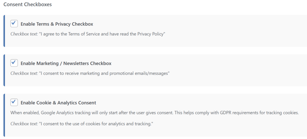 - Enable Marketing / Newsletters Checkbox: Активирует отдельный чекбокс для подписки на маркетинговые рассылки.