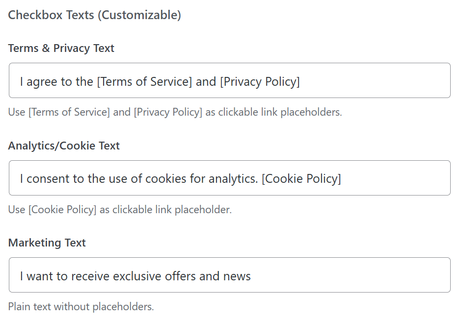 Кастомизация текстов согласия: Блок Checkbox Texts (Customizable) позволяет перевести тексты чекбоксов на любой язык или адаптировать их под конкретные законы. Для того чтобы документы выводились в тексте в виде кликабельных ссылок, используйте специальные переменные в квадратных скобках: