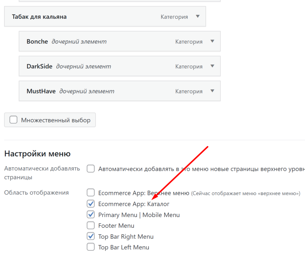 - Ecommerce App: Каталог — отметьте этот пункт для меню, содержащего список категорий вашего магазина. Категории, не добавленные в это меню, отображаться в каталоге приложения не будут.