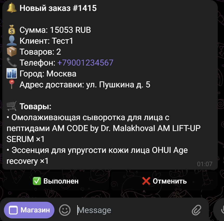 - Изменить статус заказа (например, на «Выполнен» или «Отменить») можно прямо через интерфейс Telegram-бота. При изменении статуса данные синхронизируются везде, а клиент получает автоматическое уведомление.