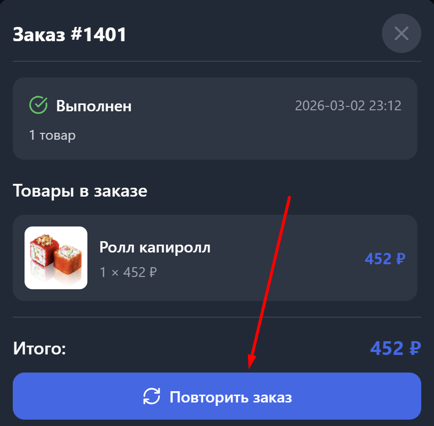 Повторение заказа: Как только заказ переходит в статус «Выполнен», в карточке этого заказа внутри профиля пользователя появляется кнопка быстрого повтора заказа.