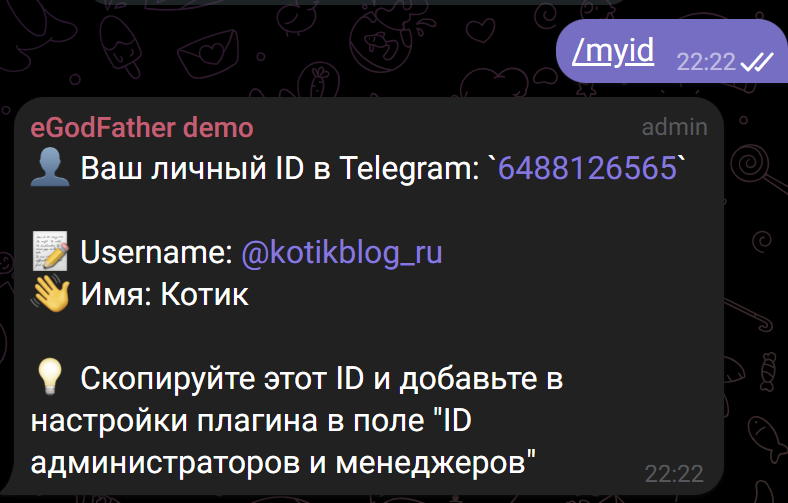- Получите ID менеджеров: попросите каждого добавленного менеджера отправить в группу команду