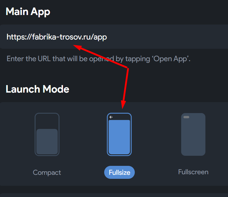 Main App. Снова вставьте ссылку в полеURL. В настройке Launch Mode обязательно выберите Fullsize (режим Fullscreen не подходит для магазинов). Сохраните изменения.