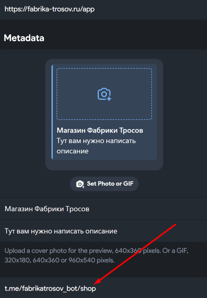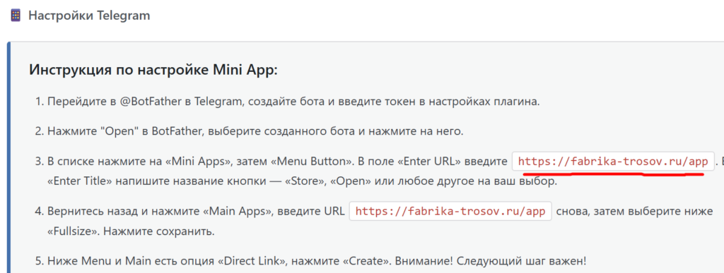 Чтобы магазин корректно открывался внутри Telegram, необходимо настроить интерфейс Mini App. Предварительно скопируйте ссылку на ваш магазин в настройках плагина WordPress (раздел EGodfather -> Подключения).