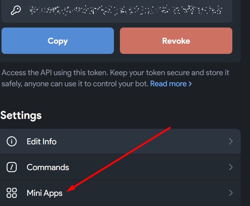 - В Telegram откройте @BotFather, выберите вашего бота и перейдите в раздел Mini Apps.