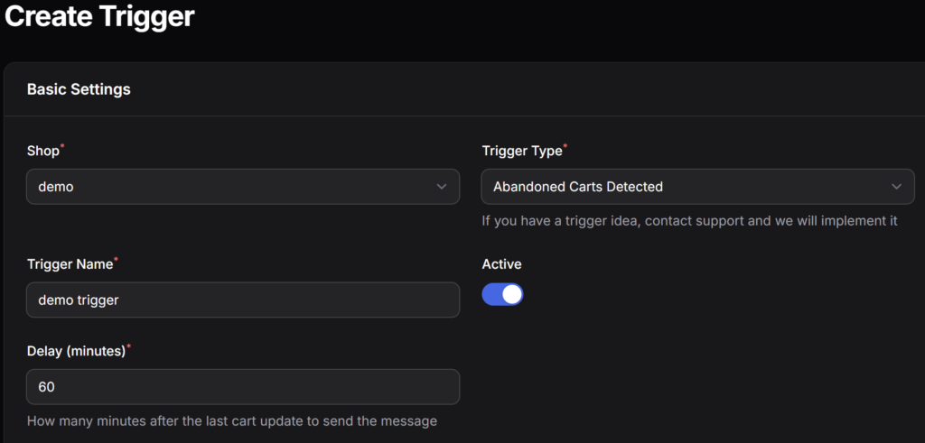 Important: An automatic trigger message is sent only once. However, if the user updates their cart contents, the countdown will start over, and the message will be sent again in 1 hour.