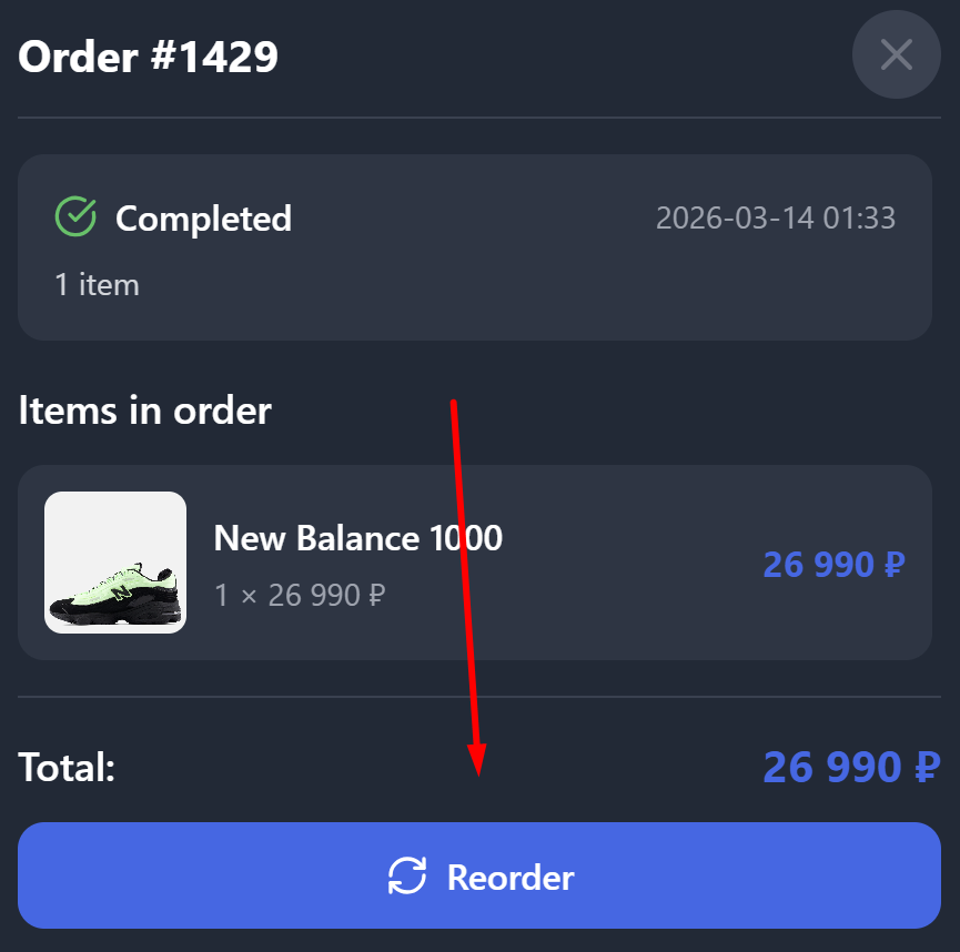 Order Repeat: As soon as an order moves to the “Completed” status, a quick repeat order button appears in that order’s card inside the user profile.