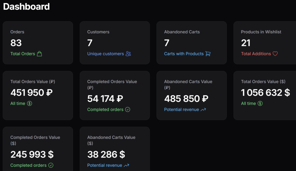 Dashboard: The panel’s main page displays summary statistics: the number of orders, the number of unique customers, unpaid carts, and additions to favorites. The “Amount in carts” and “Items in favorites” widgets are the most important for sales analysis. For Pro plan users, access to customer contact details is available in these sections.