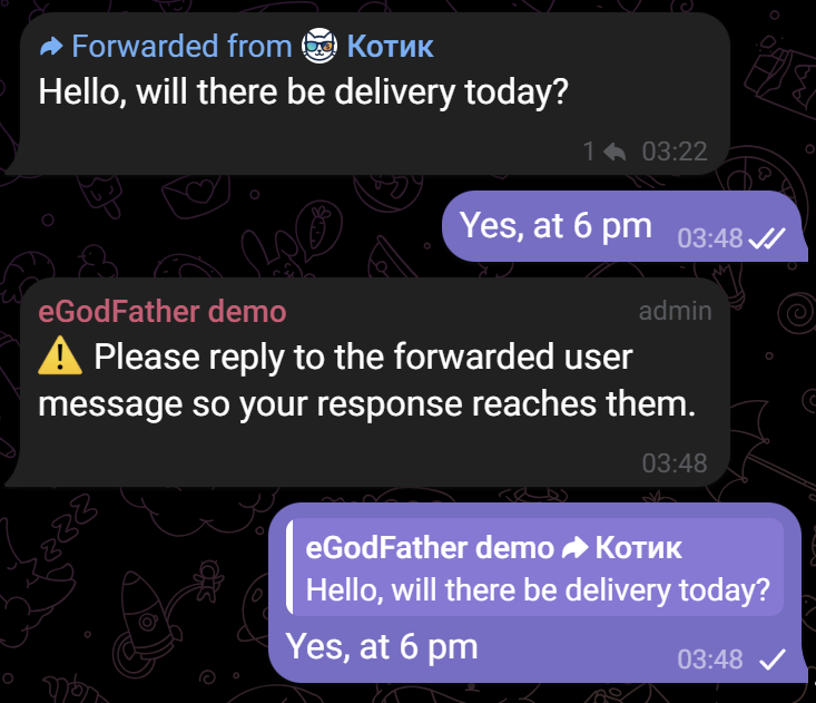 Replying to an incoming message: To reply to a customer, the manager must use the standard messenger “Reply” function on a specific user message within the group. This is necessary so the bot can determine which specific customer the reply is addressed to. The user will receive the response on behalf of the bot, rather than from the manager’s personal account.