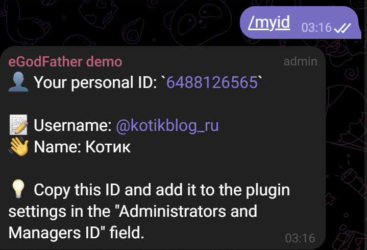 Warning: When adding new members, the group type may change to a “Supergroup,” which will cause its ID to change (for example, from -50… to -100…). In this case, you must request /id again and update the plugin settings.